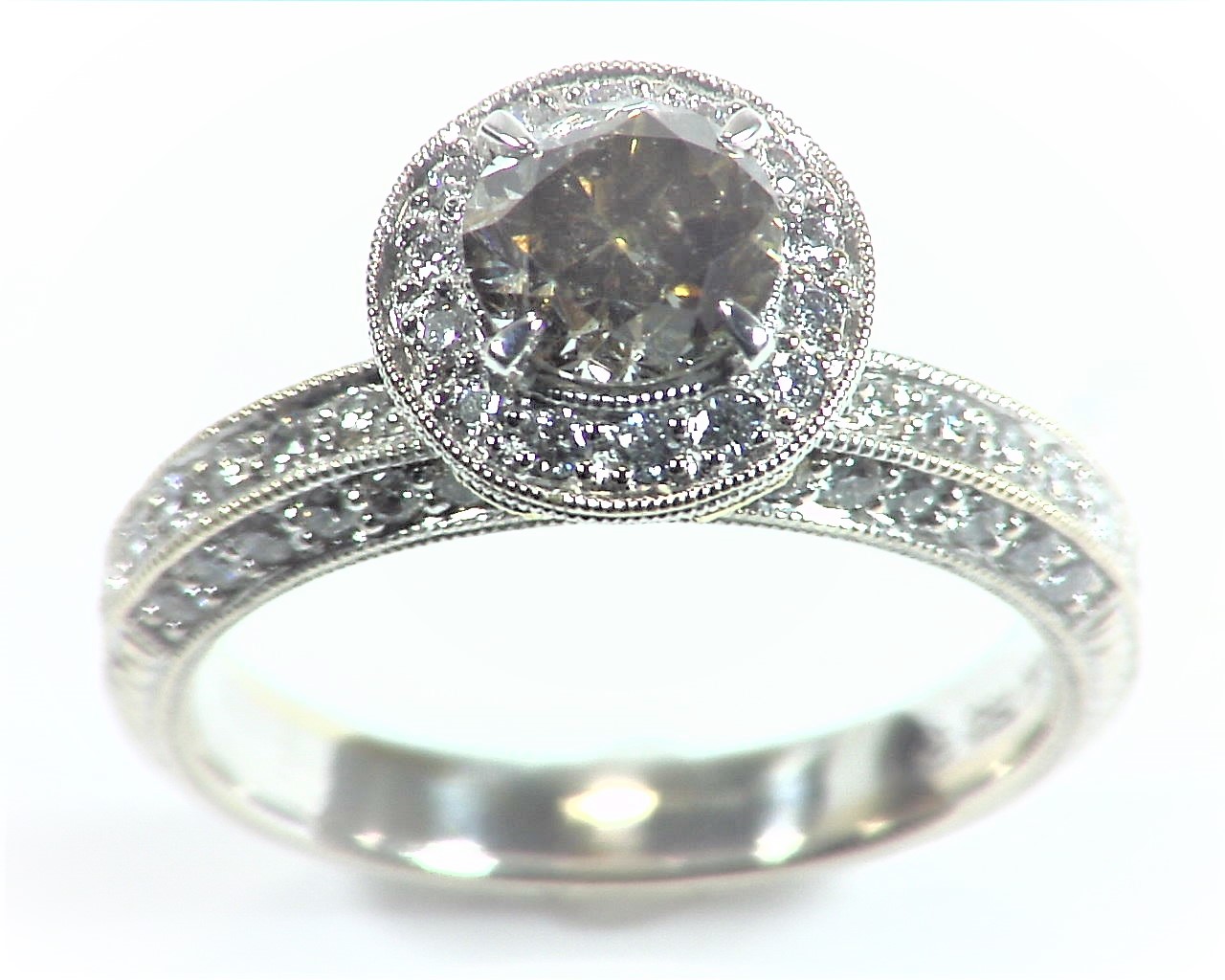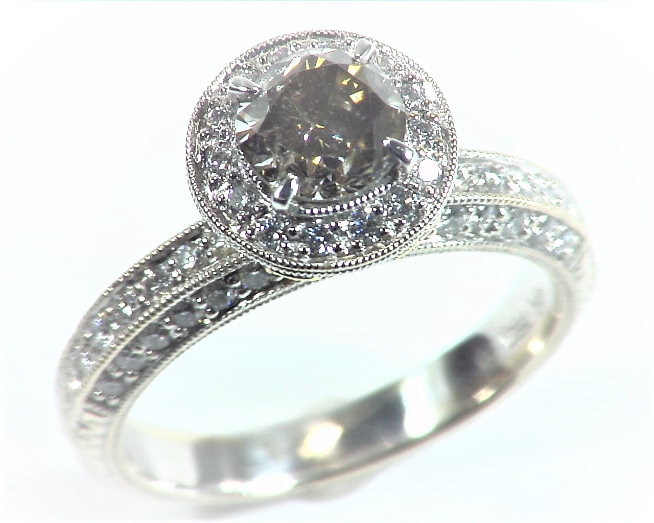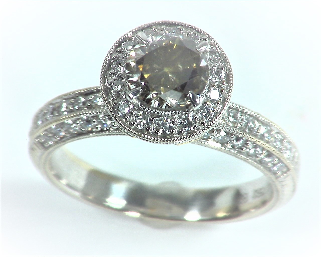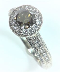 Today’s item is a beautiful genuine 1.08 champagne diamond set with .66 cts of white and yellow small diamonds in 18 kt white gold setting, this is a one of a kind hand made piece which is perfect for an engagement ring, the ring was designed by one of my good colleges who design jewelry for the stores in Beverly Hills California, The ring size is 6.25 and can be sized to fit and we can size it accordingly free of charge upon request before we ship it out,