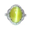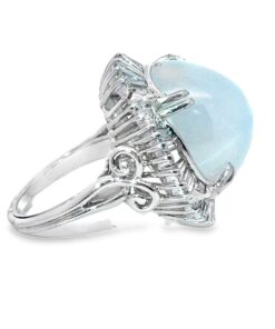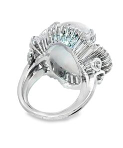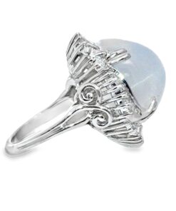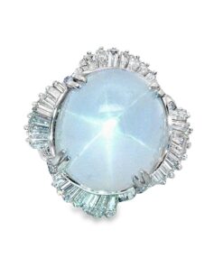 Indulge in the celestial allure of this platinum cocktail 36 CT Star Sapphire ring, featuring a captivating oval Star sapphire Gemstone at its heart. The mesmerizing gemstone is elegantly embraced by a halo of meticulously set diamonds, creating a harmonious blend of classic design and refined sophistication. Its smooth texture and fascinating glow embodies understated elegance.
