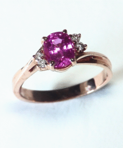 This is a Natural genuine Pink Sapphire from Sri Lanka it has a special princess cut and the Pink sapphire gemstone looks like a pink diamond set in a simple design 14 kt white Gold Setting and this is perfect as an engagement Ring, as the Sapphires are hard and the hardness is 9 next to Diamond the Hardness is 10 this is the perfect stone, for some one to use this ring day to day and also enjoy the beauty of the Pink Sapphire with 4 diamonds total each side mounted with two genuine diamonds.